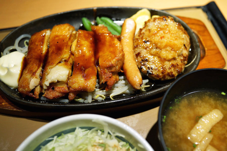 例えばミックスグリルなんてメニューをたのむと、なるほど、HottoMottoの弁当の具材が鉄板の上に並んでる。