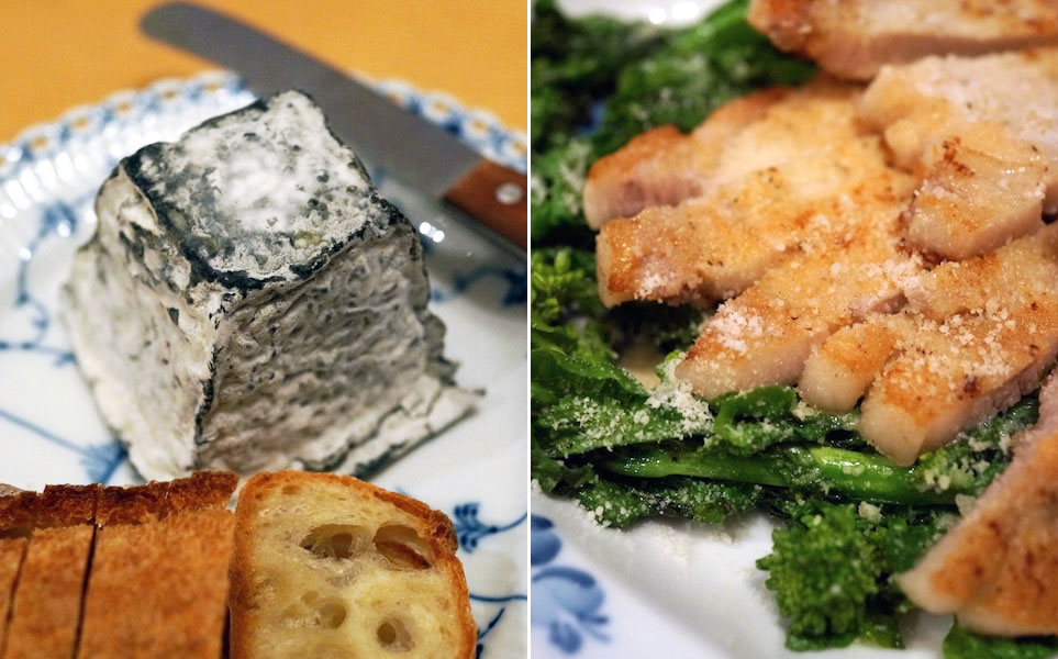 豚のリブロースに小麦を叩いてこんがり焼いて、焼いた菜花と一緒に食べる。どちらもパルミジャーノをタップリかけて味出しとして、お腹をたのしく喜ばす。