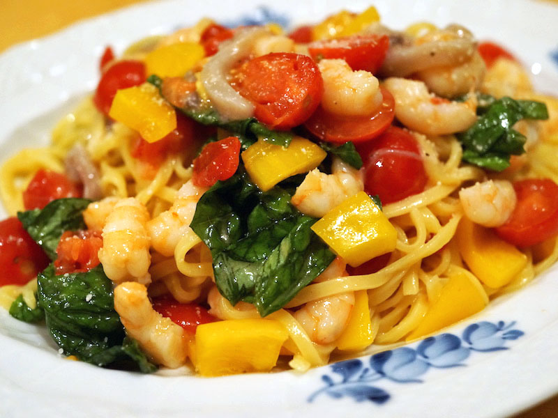 茹でたエビと黄色いパプリカ。味を出すためイカの塩辛を少々入れて、パスタと合わせてグイグイ揉んですべてをからめる。