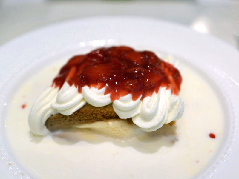 スポンジケーキと違って甘みが控えめで、だからクリームやイチゴの甘みや風味がひきたつオモシロサ。