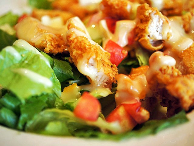 ここの名物のチキンフィレをスティック状に揚げたのを、細かく一口大に切りドサッとのせる健康的とはいカロリーが入り混じる、まさにアメリカ的なる一皿。