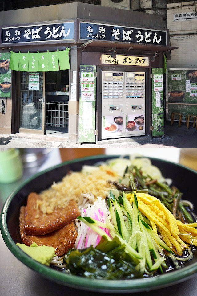 フランス語にて「new bridge」、つまり新橋というのも名前の立ち食い蕎麦にする。