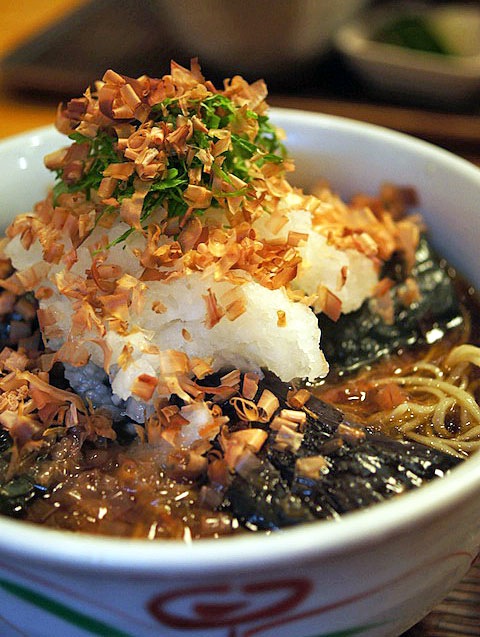 荒く削った鰹節、ネギにスッキリ、かえしの風味が際立った冷たいタレが香りを添える。