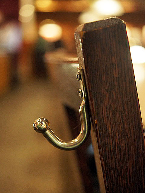 椅子の背中に荷物をかけるフックがギリッと。一本、ねじ込まれていて、女性の小さなハンドバッグをかけて置くのにちょうどいい。