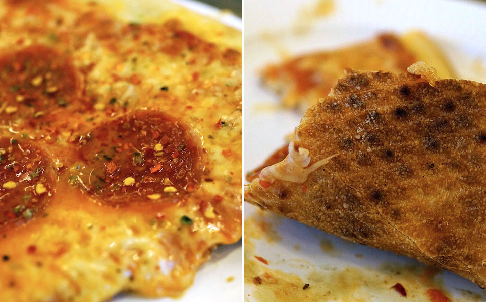 具材は薄切りのペパロニだけで、それ以外はトマトソースとチーズだけ。テーブルの上にブラックペパや粉末にしたオレガノ、赤唐辛子が用意されてて、それを好みでふりかけながら食べるというモノ。