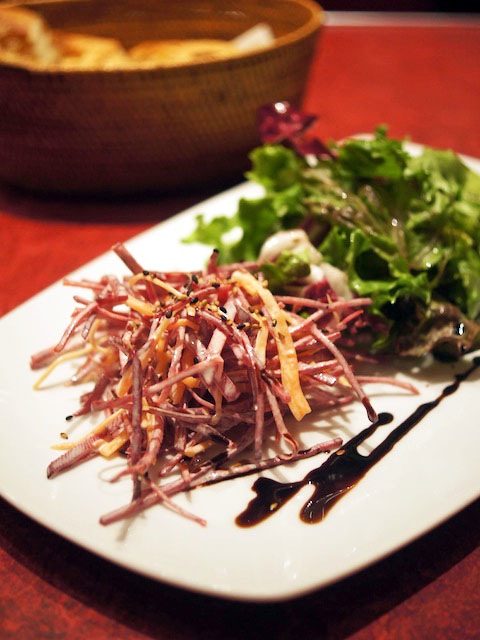 ニンジンとビーツを細切りにして、レムラードで味を整えたサラダ仕立ての野菜の前菜。