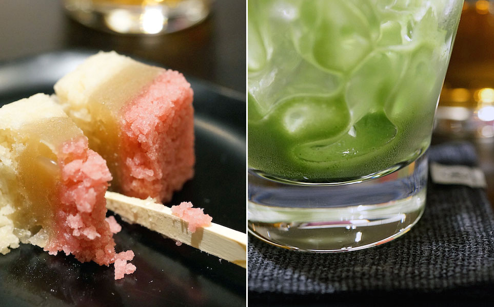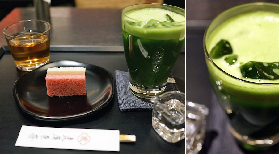 茶筅で泡だて、その泡が大きな氷を包み込むようにしてずっとグラスの中にある。フックラとした飲み口に、やさしい渋みがお菓子の甘みを引き立てる。頭に元気が戻ります。