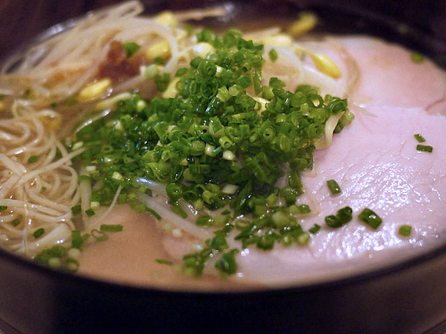 香港麺を固めに茹でて鉢に盛りスープと具材、ネギを散らして出来上がり。