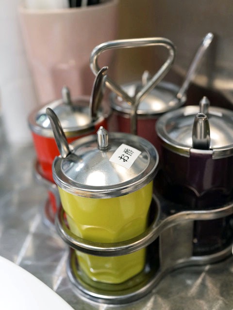 テーブルの上にコンディメントのポットが4つ…、乾いた赤唐辛子を砕いたモノに輪切りの赤唐辛子を漬けたお酢、ナンプラーに砂糖というのが中身で、タイ料理のお店に行くとどこも必ずこの四種類の薬味が用意されている。