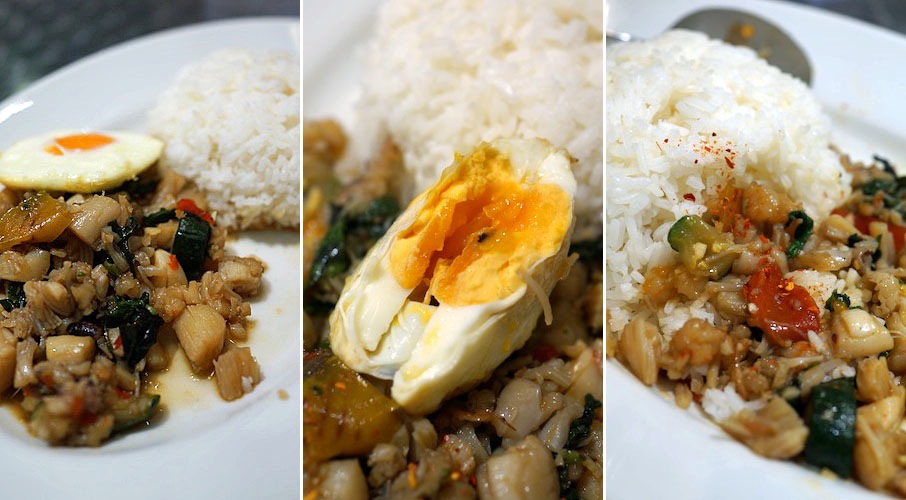 豚のガパオ、鶏肉ガパオ、それからシーフードのガパオと3つの種類があって、そのシーフードがオキニイリ。