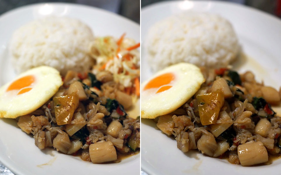茄子にネギ、パプリカ、それからズッキーニ、野菜も豊富でなによりホツホツ食感にぎやか。カチッと炊けたジャスミンライスというのが本格的でボクは好き。