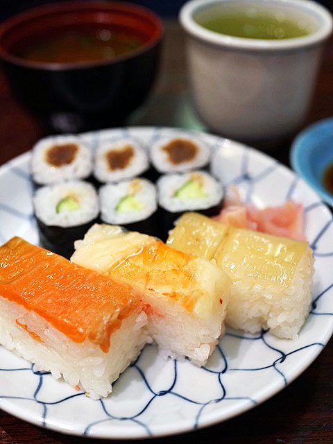 押寿司3個にかっぱに干瓢巻きが付く。
