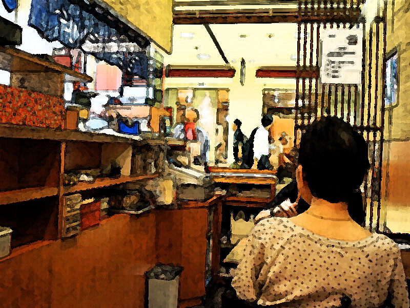 昔、商店街にはこういう間口の狭い飲食店が沢山あった…、大抵、入り口の脇の部分にはショーケースがあり、そこでおみやげ用の商品が売られていたりしたものでした。