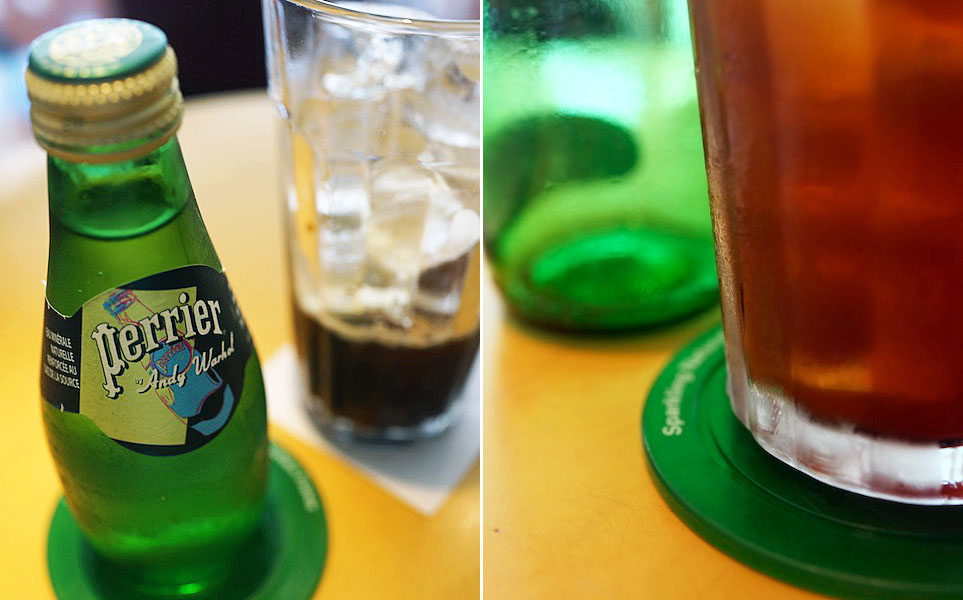 たのむとトレイにペパーナプキンとペリエ模様の緑のシリコンコースターが並んで置かれる。小さな瓶入りペリエと、氷の上にエスプレッソを注いだグラスの両方がきて、グラスにペリエを注いで飲んで!シルブプレって趣向の商品。