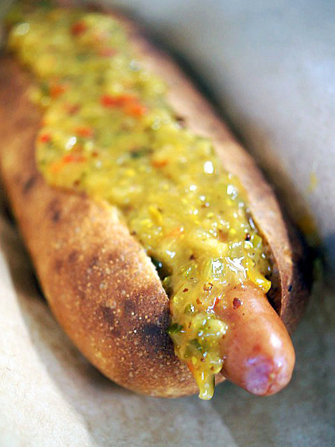 マスタードレリッシュ添えたホットドッグ。