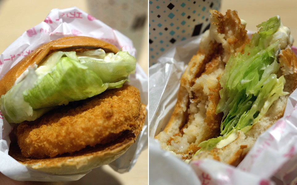 噛むとまずはバンズが前歯でしたたか抵抗し、それに続いてレタスがザクリ。ガリッとパン粉衣が散らかる、かなり噛みごたえのあるのにビックリ。