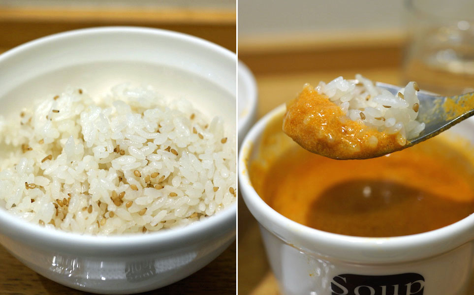 胡麻を散らした、軽い塩味を感じるご飯。ホツホツ固めに仕上がっていて、それをスプーンにちょっと乗っけて、ビスクにトプリと浸してパクリ。