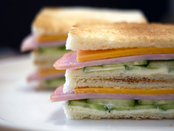 水分、キッチリ吐き出させ甘味をギュギュッと凝縮させたそのパンで、ハムとキュウリとチェダーチーズ。
