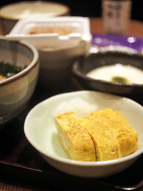卵焼きに納豆、とろろ、海苔に味噌汁の代わりの蕎麦、それに佃煮。